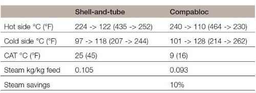 The operating data shows that the Compabloc heat exchanger outperforms the previous shell-and-tube. Table 1 shows the average inlet and outlet temperatures for the shell-and-tube and the new Compabloc.