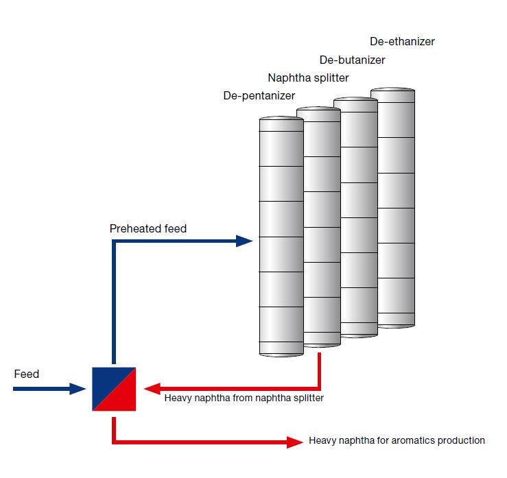 This is done in the feed fractionation unit (FFU), which is made up of four distillation columns: the de-pentanizer, naphtha splitter, de-butanizer and de-ethanizer. The feed going into the first column, the de-pentanizer, is preheated by the heavy naphtha stream from the naphtha splitter.